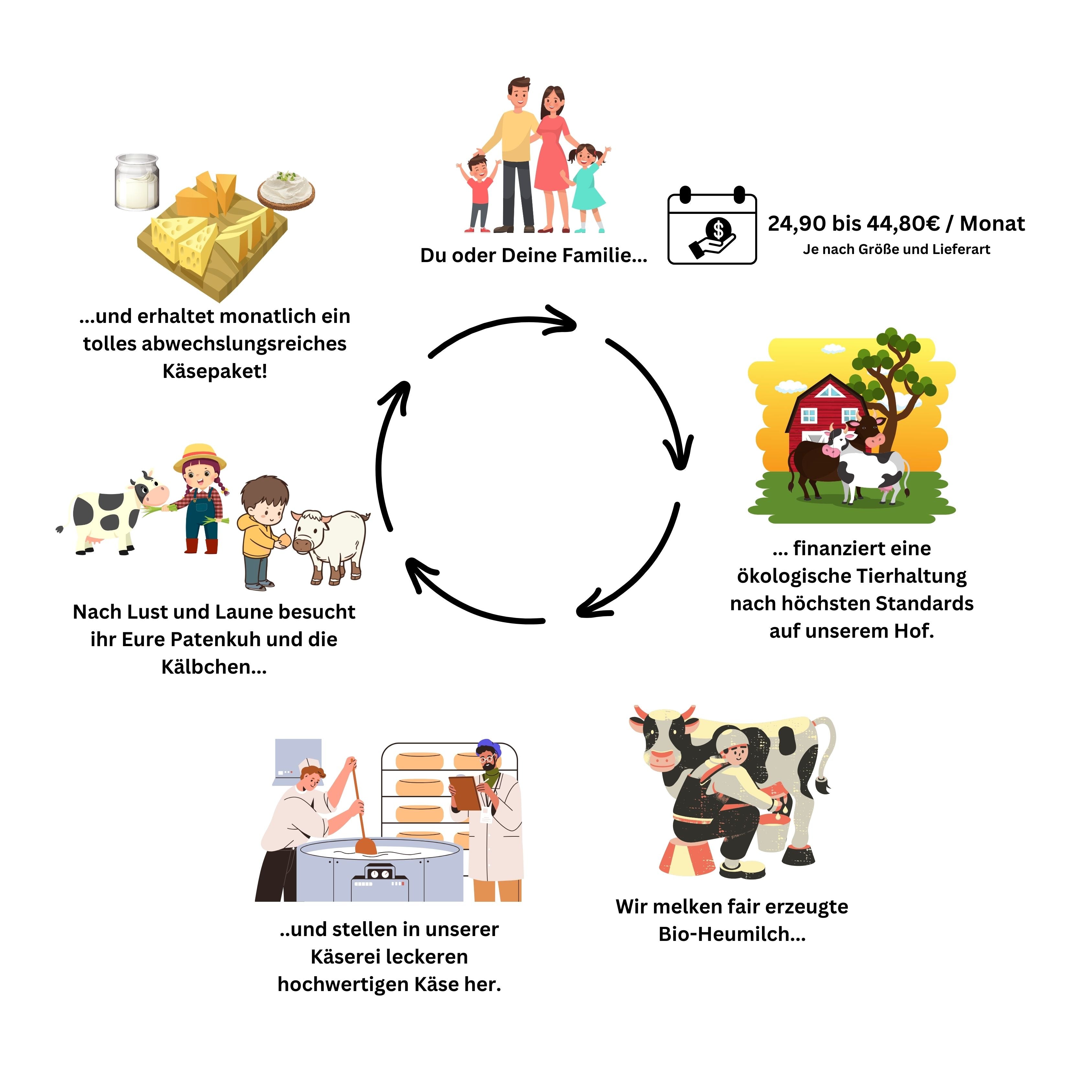 Wir nennen das Kuhpatenschaft inkl. Käseabo. Direkt ohne Zwischenhändler und jederzeit kündbar!